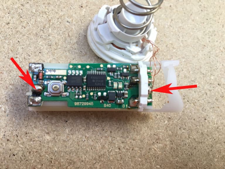 Die drei Litzendrähte, die von der Platine zur Spule im Boden führen, werden aus der Kunststoff-Halterung entnommen. Anschließend werden die beiden Verbindungen zum Motor ausgelötet.