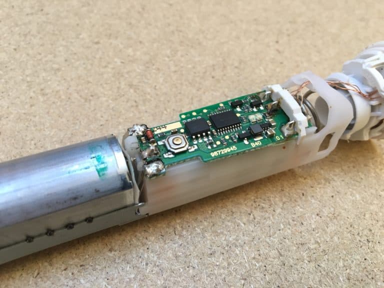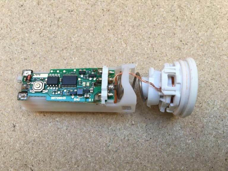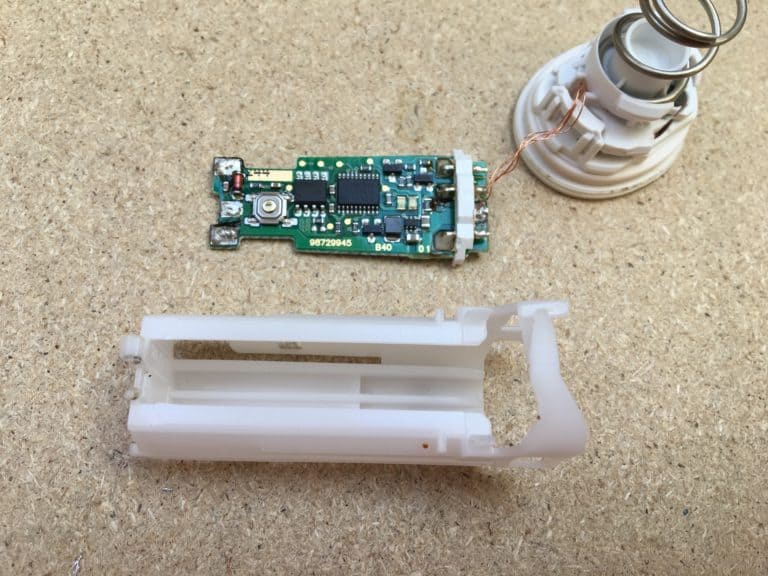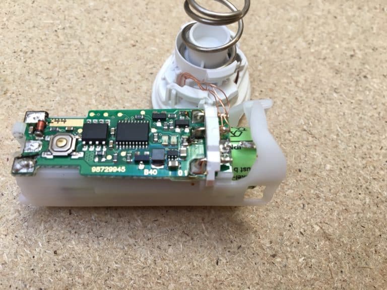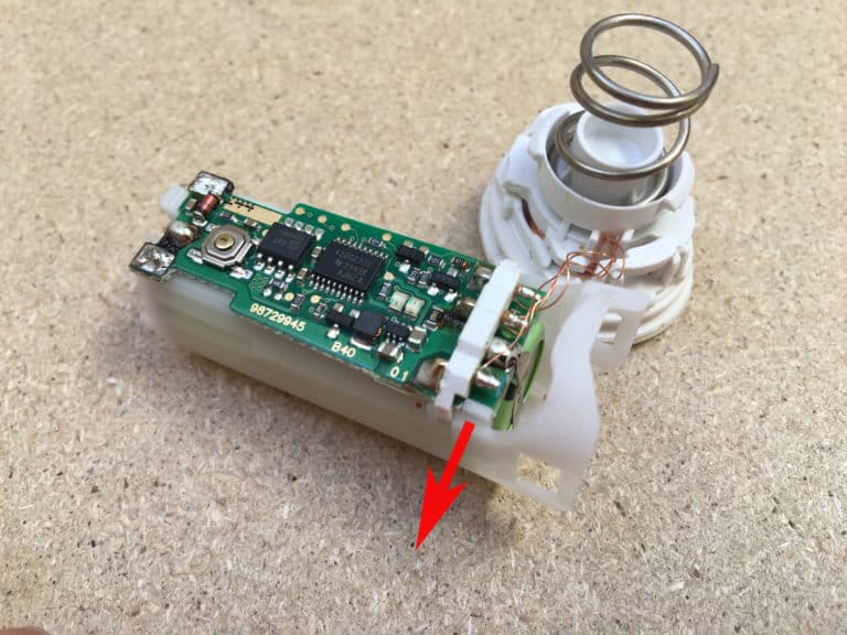 Danach wird der neue Akku ins Gehäuse geschoben, die Platine eingesetzt und die beiden Lötfahnen des Akkus wieder angelötet.