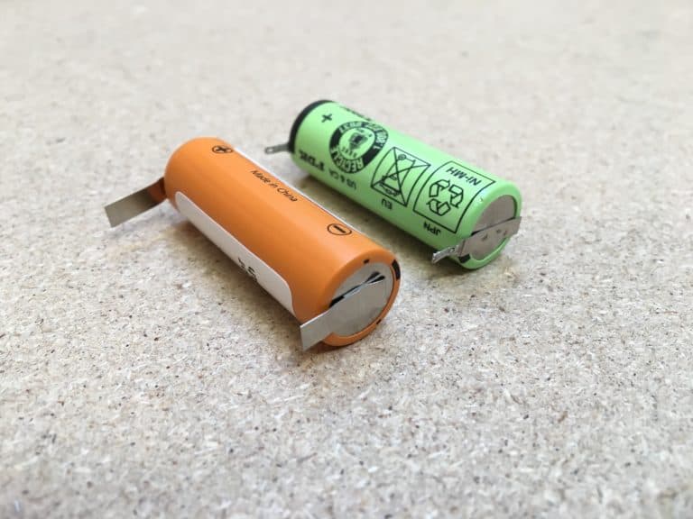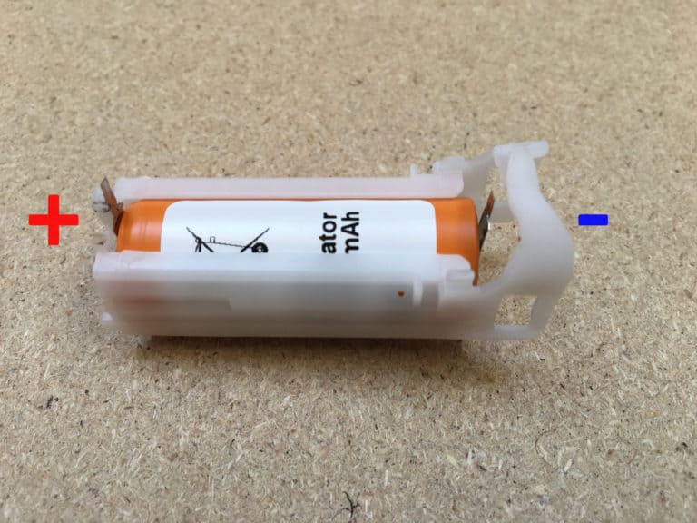 Bei dem hier verwendeten Akku von Panasonic werden die Anschlüsse zurechtgeschnitten und der Plus-Pol gekürzt. Da es sich um einen Akku mit Z-Fahne handelt, aber U-Fahnen benötigt werden, wird der Minus-Pol um 180° umgebogen.