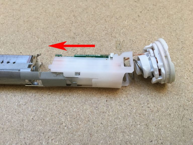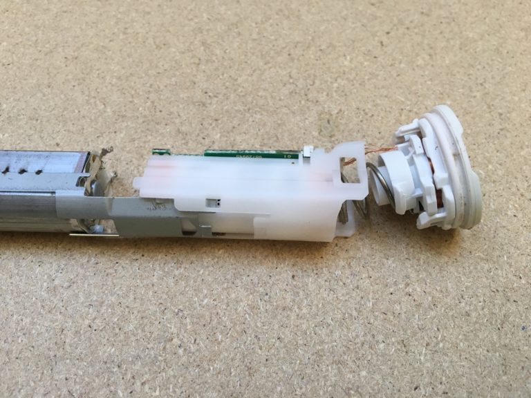 Nun ist das Innenleben vollständig zusammengesetzt und kann wieder ins Gehäuse geschoben werden. Die Zahnbürste wird in die Ladestation gestellt und gegen die Feder nacht unten gedrückt, sodass sich das Gehäuse schließt. Danach wird die Zahnbürste mit einer Achteldrehung im Uhrzeigersinn wieder vollständig geschlossen.