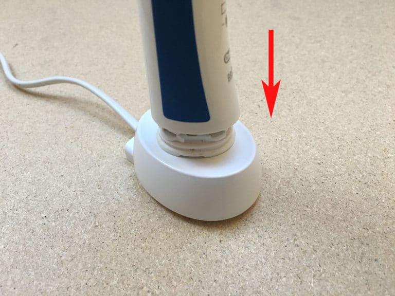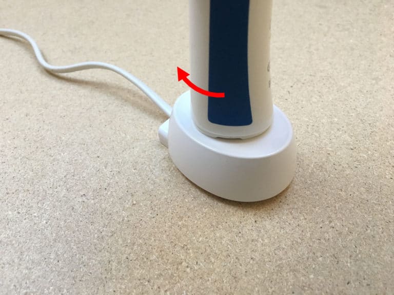 Als nächstes wird das Gehäuse geöffnet, indem die Zahnbürste auf die Ladestation gesetzt und eine Vierteldrehung gegen den Uhrzeigersinn gemacht wird. Die verbaute Feder drückt ein Stück des Bodens selbstständig aus dem Gehäuse.