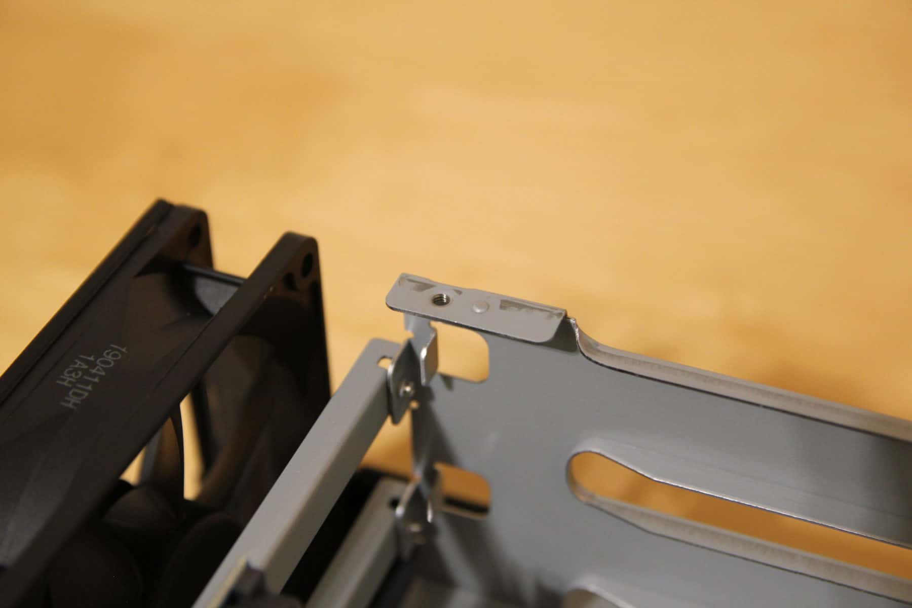 Ersatzlüfter laut Bild einsetzenSchutzgitter anschraubenUltra Low Noise Adapter RC12 verwenden und Haltenase anschraubenGehäuse zusammenstecken und zusammenschiebenLüfterumbau abgeschlossenFestplatten einstecken und Front wieder anbringen