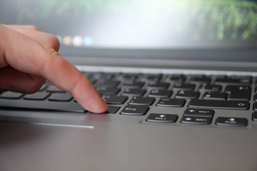 Bei festem Druck in eine der unteren Ecken lässt es sich, wie bei IdeaPads üblich, 1-2 mm tief eindrücken.