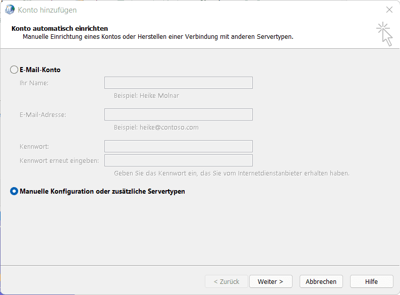 Seit Office 2016 ist es schwierig, Outlook mit manuellen Servereinstellungen zu konfigurieren. Dies gilt ebenso für Office 2019, 2021 und Outlook aus dem Office Microsoft 365 Abo.