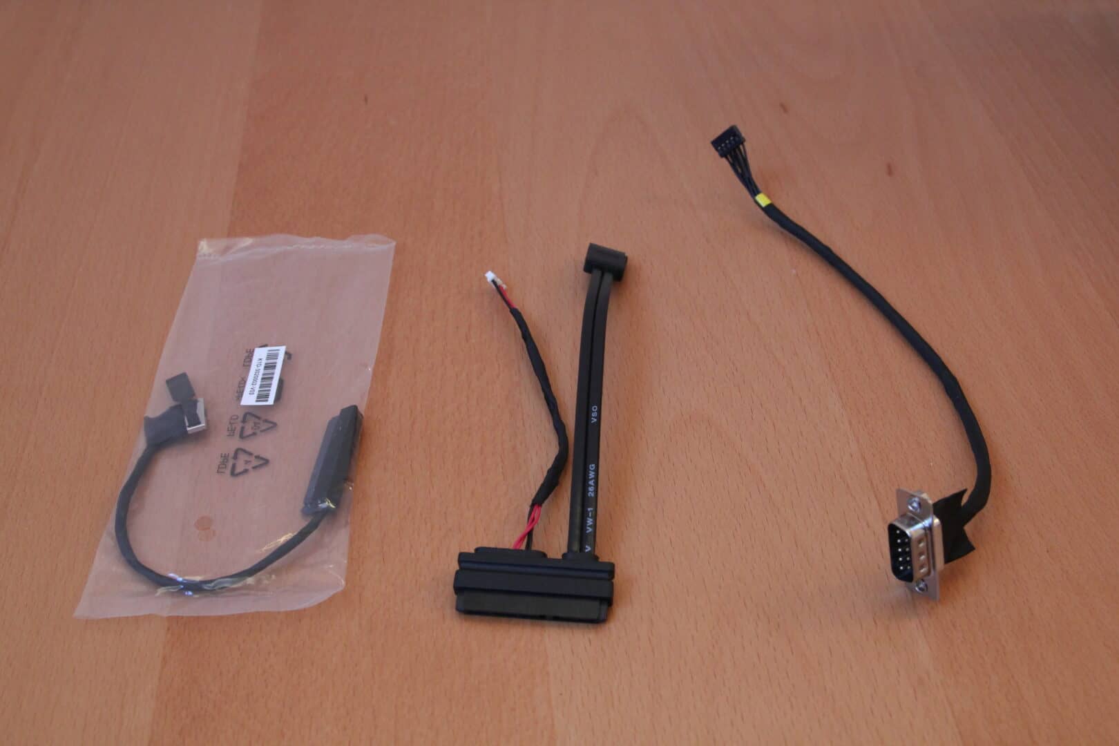 Neben dem Gehäuse mit integrierten Mainboard und vorinstalliertem WLAN liegt ein externes 120W Netzteil und zwei SATA Kabel für 2,5″ Festplatten bei. Zusätzlich gibt es eine Rarität, ein Kabel, um die serielle Schnittstelle (COM-Port) nach außen zu führen, gehört auch zu den Beigaben.
