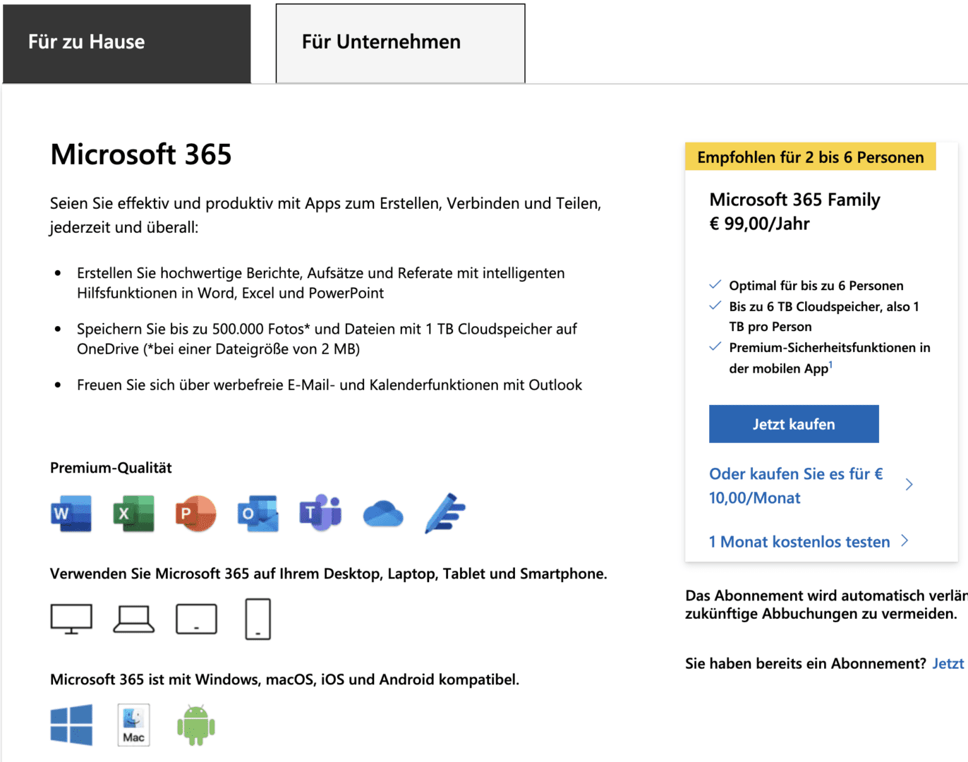 Microsoft verlangt aktuell 99€/Jahr für das Microsoft 365 Family Paket für maximal 6 Personen.