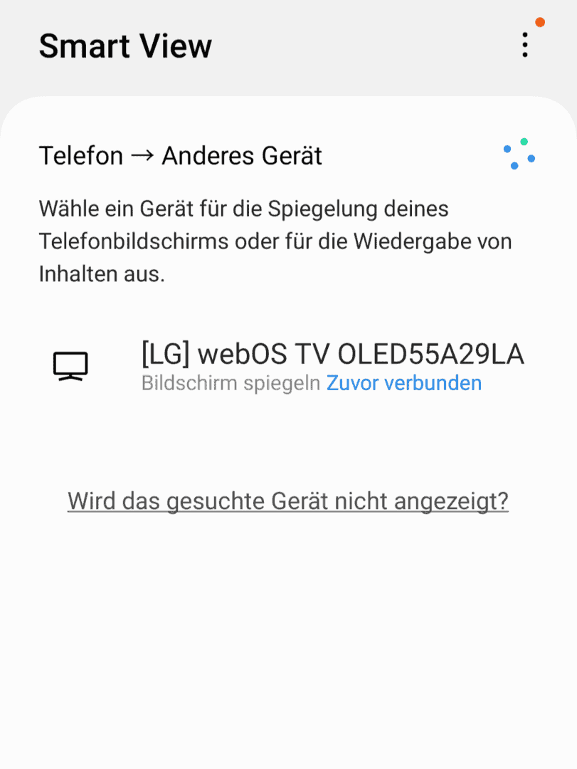 - In den Samsung Schnelleinstellungen (8 Buttons unten, seitlich Wischen möglich) Smart View starten