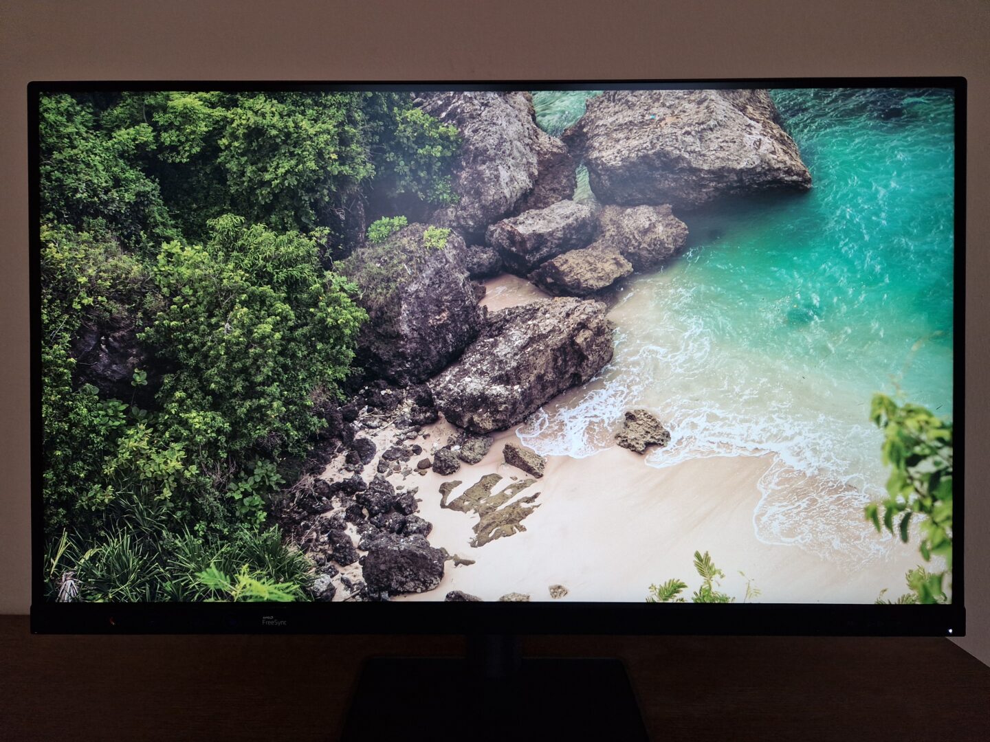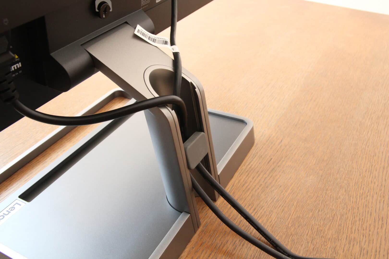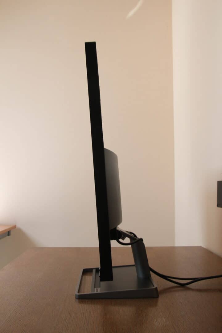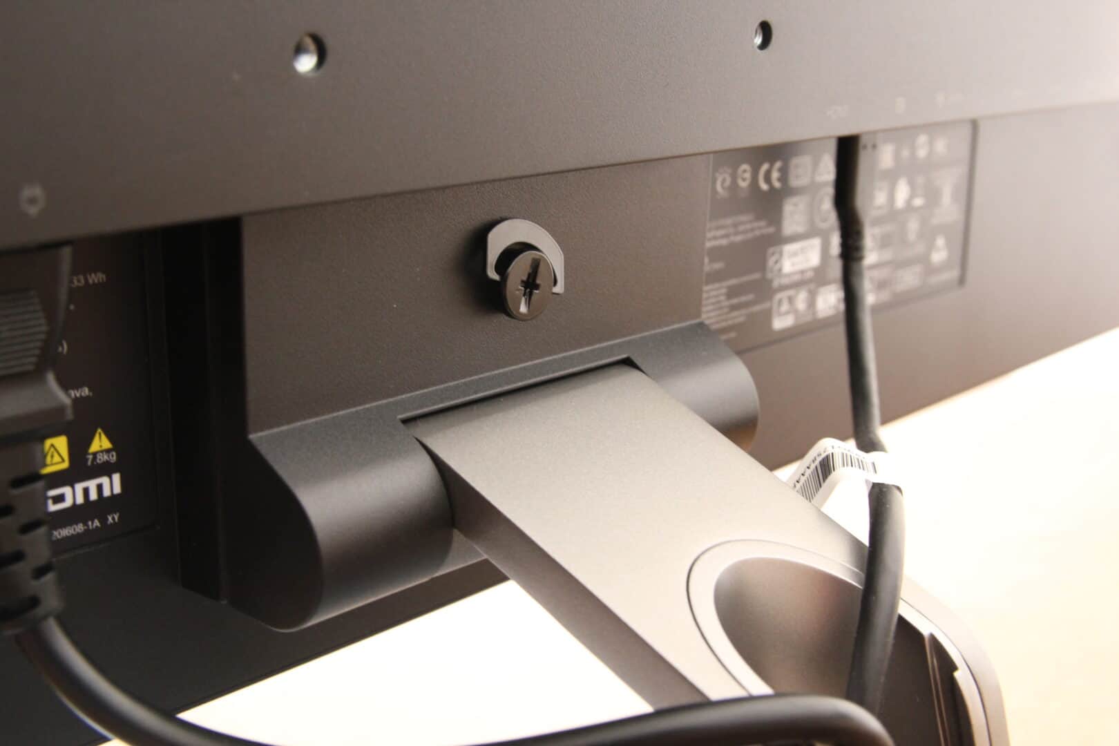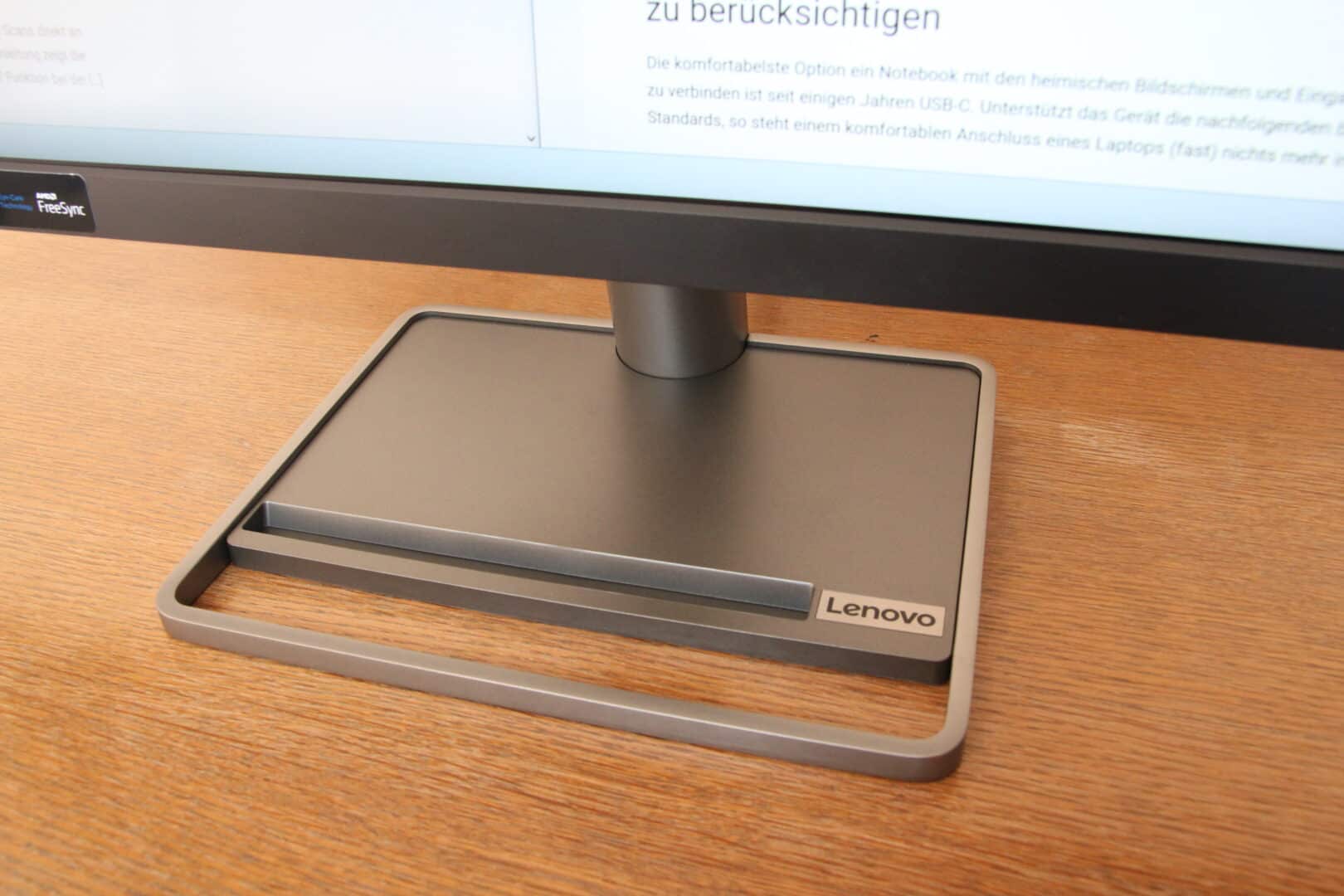 Der Standfuß ist massiv und hält den großen Monitor sicher. Zwei Schrauben halten ihn zusammen, welche werkzeuglos montierbar sind. Die VESA 100×100 Befestigungslöcher sind frei für eine alternative Halterung, auch mit Höhenverstellung. Aber auch für die Montage eines Mini-PC ala ASRock Deskmini.