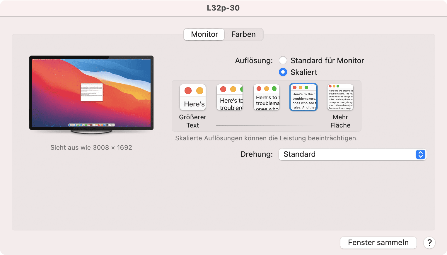 Bei macOS liegt eine angenehme Schriftgröße bei der virtuellen Auflösung von 3008 x 1692.