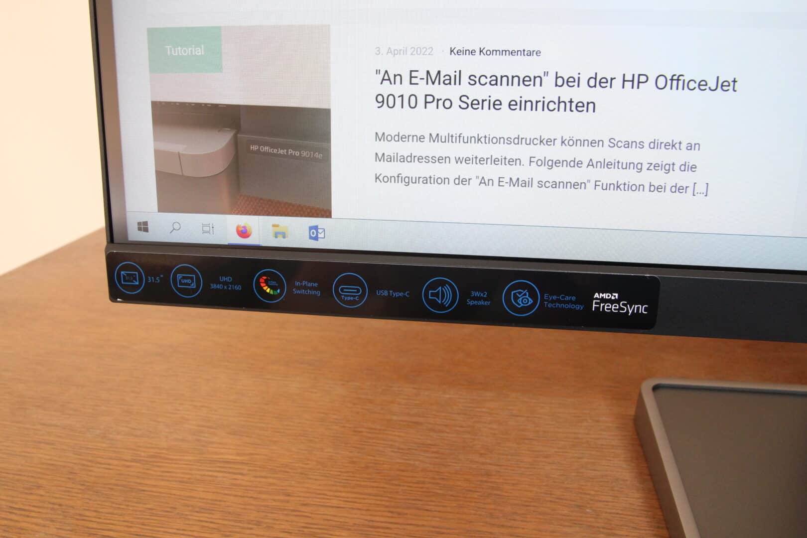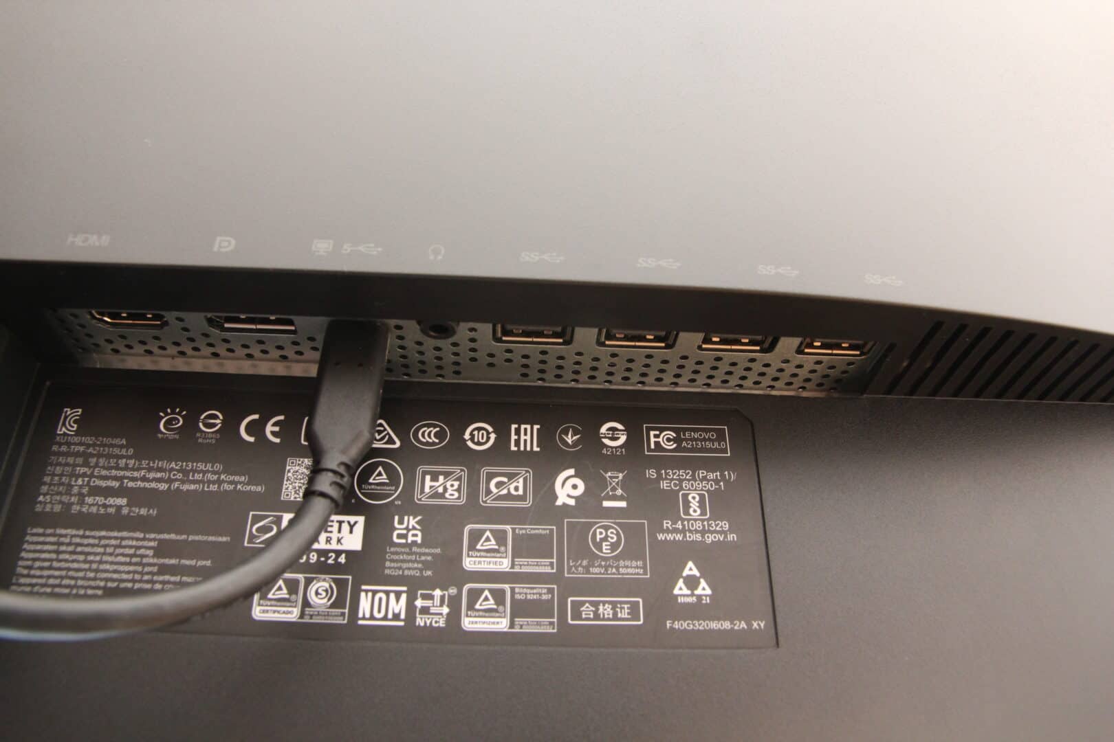 Der Bildschirm hat HDMI 2.0, DisplayPort 1.2, USB-C mit PowerDelivery und DisplayPort, einen 3,5 mm Klinkenausgang und 4x USB-A 3 Anschlüsse. Die Ladeleistung von 60 bis 75 Watt via PowerDelivery hängt unter anderem von der Bildschirmhelligkeit ab. Näheres dazu weiter unten.